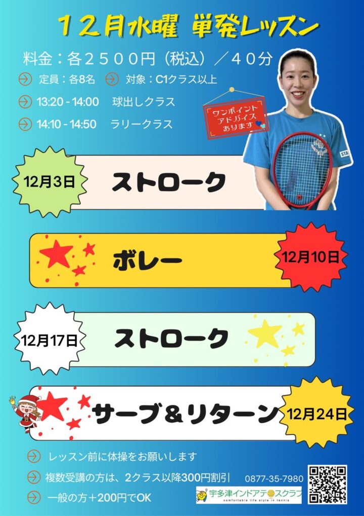 🎾【12月水曜・単発レッスンのお知らせ】🎾