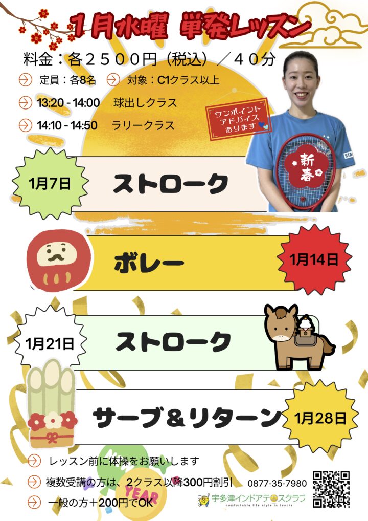 2026年のテニス初めにぴったりな「1月水曜単発レッスン」を開催いたします!